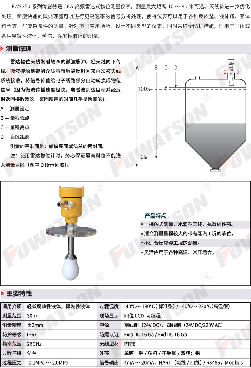FWS350系列傳感器是26G高(gao)頻雷達式物位測(cè)量儀表,測量最🌂大(da)🐆距離10~80米可選。針對(dui)不同應用場所,設(she)計不同類型的儀(yi)表,同💚時采取全防(fáng)護🛀措施,适用于固(gù)體或各種🌈腐蝕性(xìng)液體、蒸汽、揮發💁...