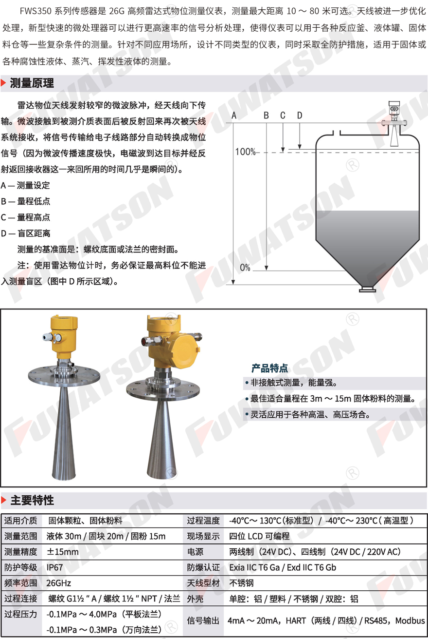 FWS350系列(liè)傳感器是(shì)26G高頻雷達(da)式物位測(ce)量儀表,測(ce)量最🙇♀️大距(jù)離10~80米可選(xuan)。針對不同(tóng)應用場所(suo),設計不同(tóng)類型的儀(yí)表,同時采(cai)取全防護(hù)措施,适用(yong)于固體或(huò)各種腐蝕(shi)性🚶液體、蒸(zhēng)汽、揮發...