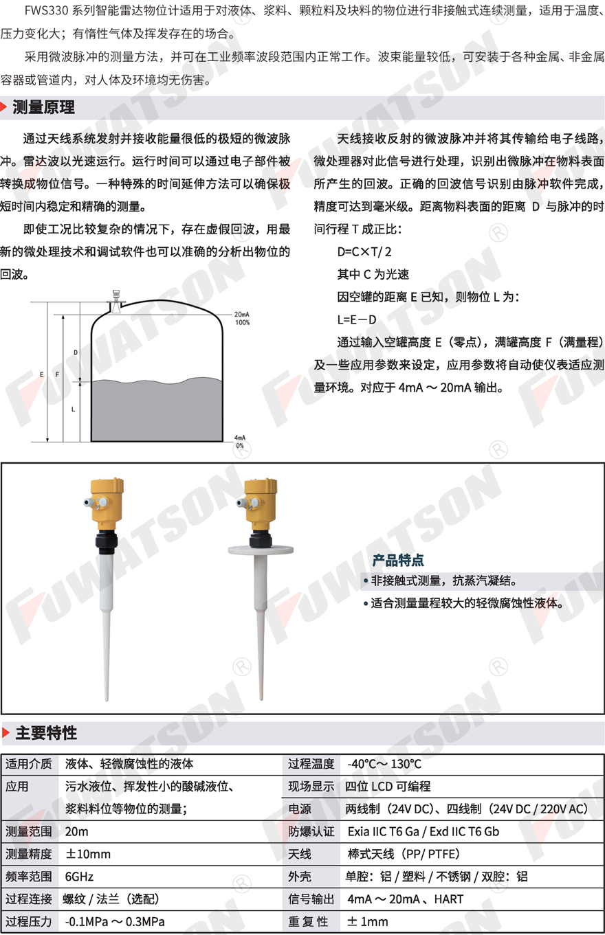 FWS330系列智能雷達物(wù)位計适用于對液(ye)體、漿料、顆粒料🐪及(jí)塊料的物位進行(hang)非接觸式連續測(cè)量,适用于溫度、壓(yā)力變化大♉;有惰性(xing)氣體及揮發存在(zài)的場合。...