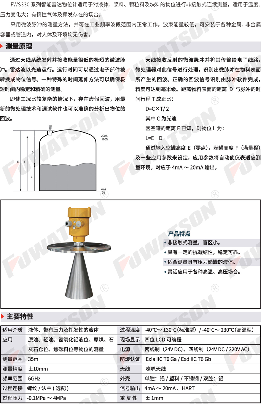FWS330系列智能雷達(da)物位計适用于(yú)對液體、漿料、顆(kē)粒料及塊♋料的(de)物位進行非接(jie)觸式連續測量(liàng),适用于溫度、壓(ya)力變化大;有惰(duo)性氣體及揮發(fa)存在的場合。...