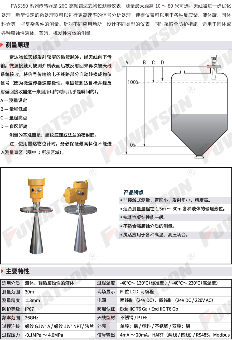 FWS350系列傳(chuán)感器是(shi)26G高頻雷(lei)達式物(wu)位測量(liàng)儀表,測(cè)量最大(dà)距☎️離10~80米(mi)⚽可🌈選。針(zhen)對不同(tong)應用場(chang)所,設計(ji)不同類(lèi)型的儀(yi)🐪表,同時(shí)采🙇♀️取全(quán)防護措(cuo)施,适用(yong)于固體(tǐ)或各種(zhǒng)腐蝕性(xing)液體、蒸(zhēng)汽、揮發(fa)...