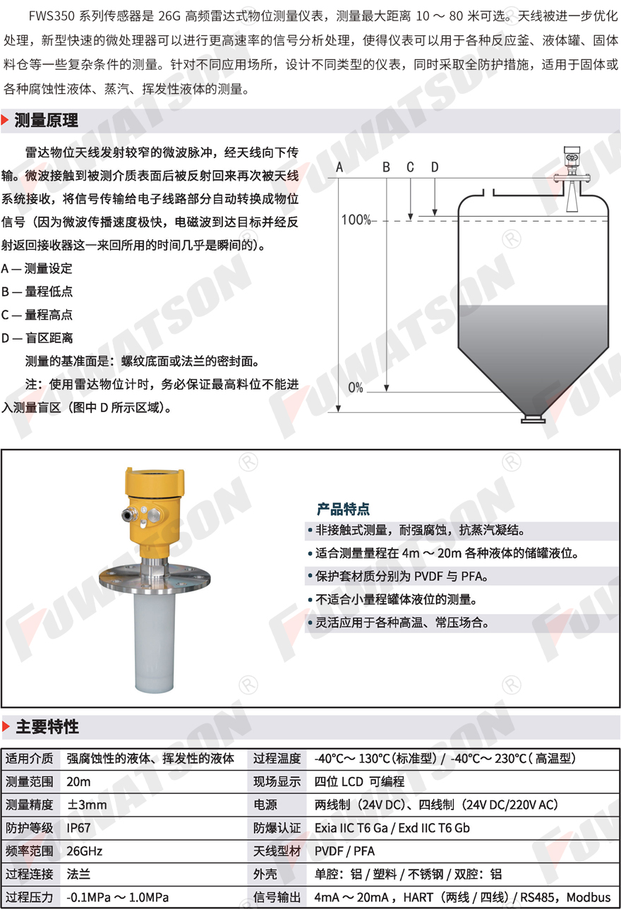 FWS350系列(liè)傳感器是(shì)26G高頻雷達(da)式物位測(ce)量儀表,測(ce)量最☎️大距(jù)離10~80米可🆚選(xuan)。針對不同(tóng)應用場所(suo),設計不同(tóng)類型的儀(yí)表,同時采(cai)⭐取全防護(hù)措施,适用(yong)于固體或(huò)各種腐蝕(shi)性液體、蒸(zhēng)汽、揮發...